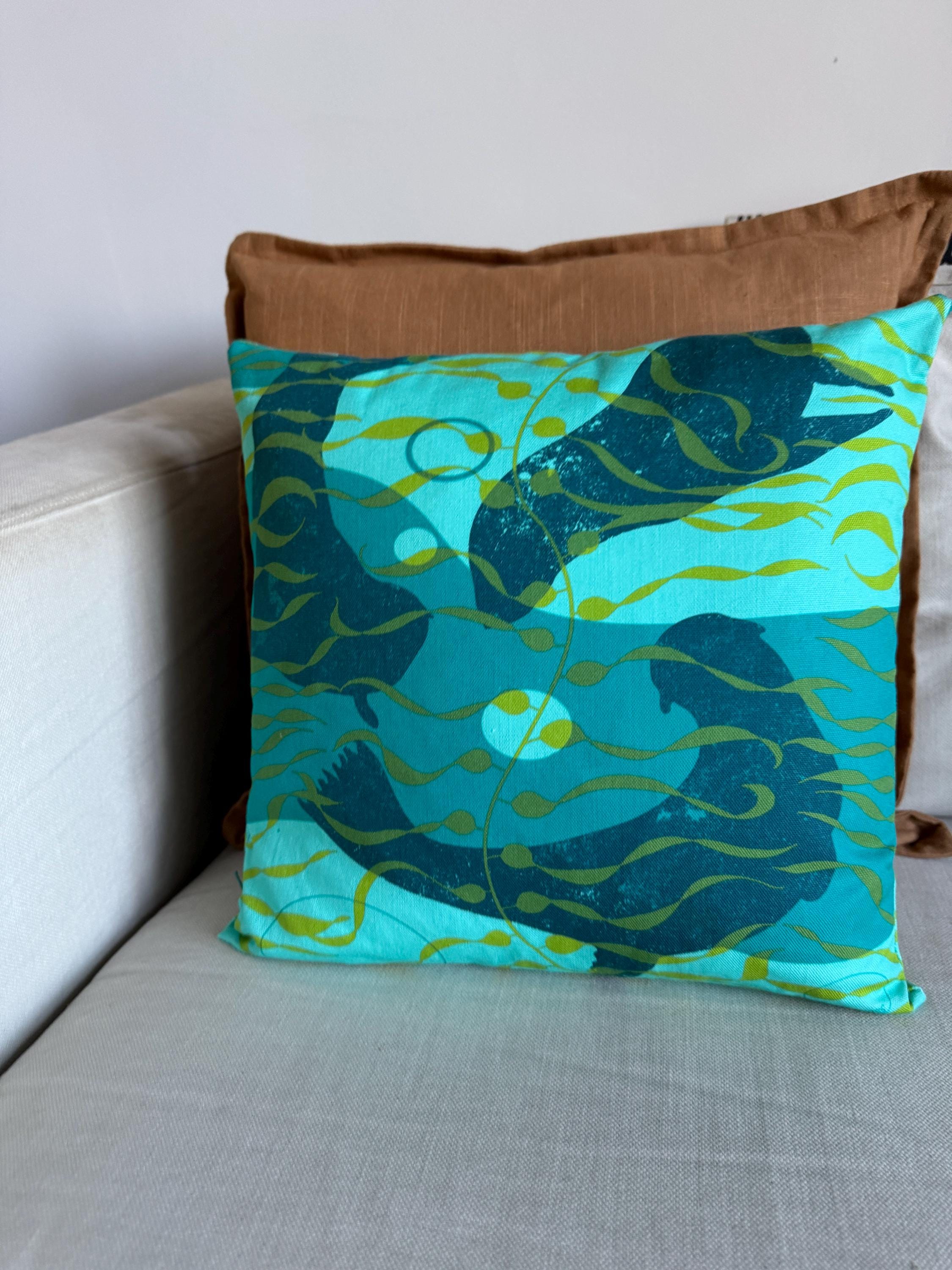 Seals play in turquoise water amongst moss green kelp on my Selkie cushion.