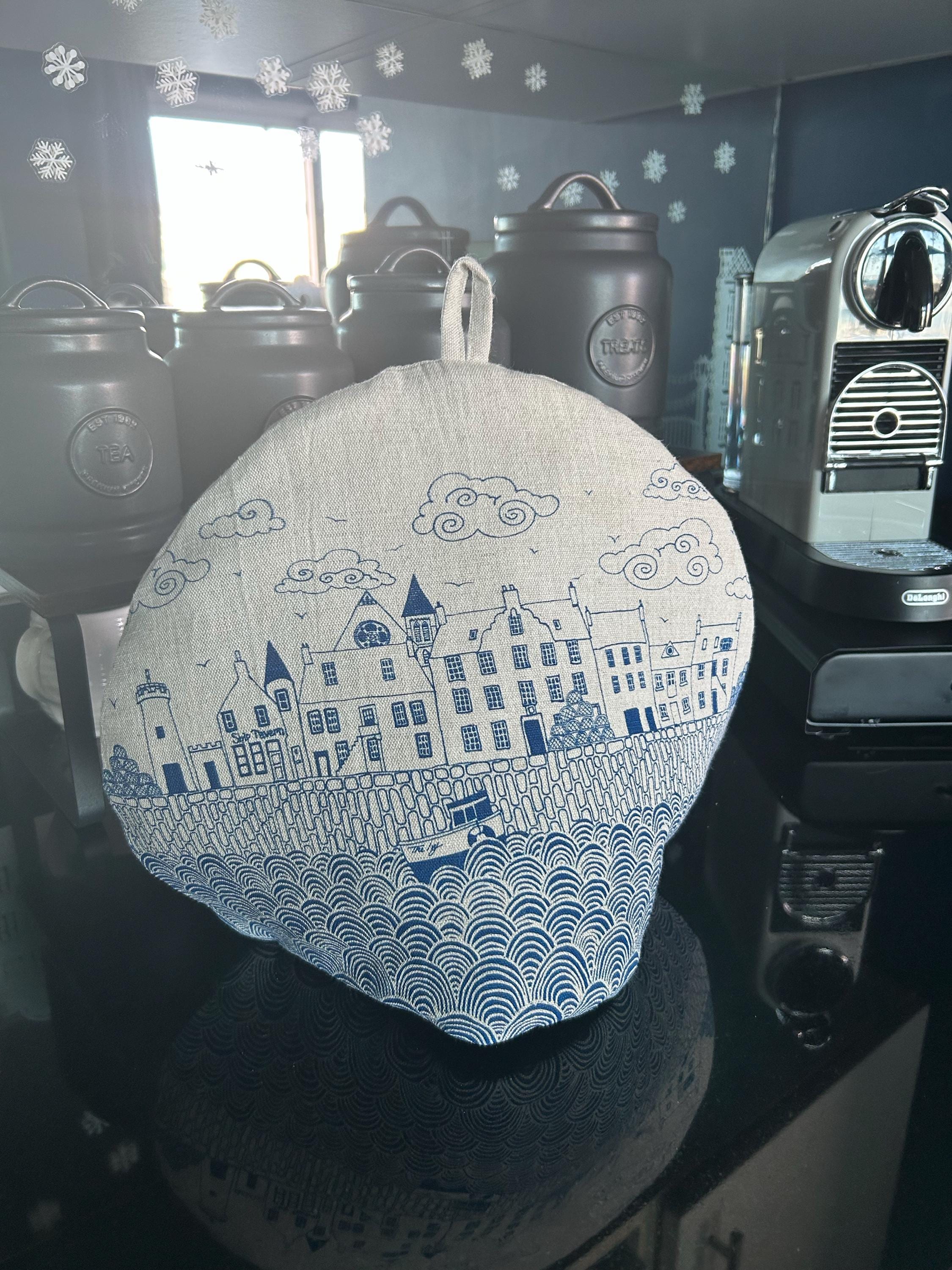 Screen printed traditional tea cosy with a nautical twist, this has a cotton outer and a quilted cotton liner. Inspired by my childhood spent in the East Neuk of Fife, this includes buildings from the waterfronts of my favourite corner of Scotland. From right to left; Cellardyke, Crail, Pittenweem, St.Monans, Anstruther and Elie.